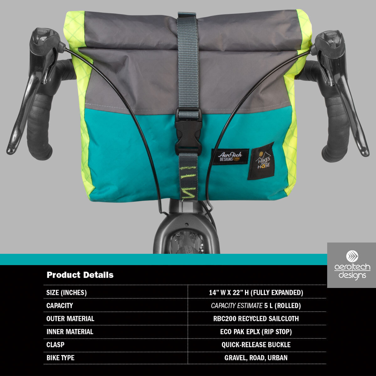 Roomy 5 L recycled sailcloth bag fits layers and tools for long gravel or road rides.