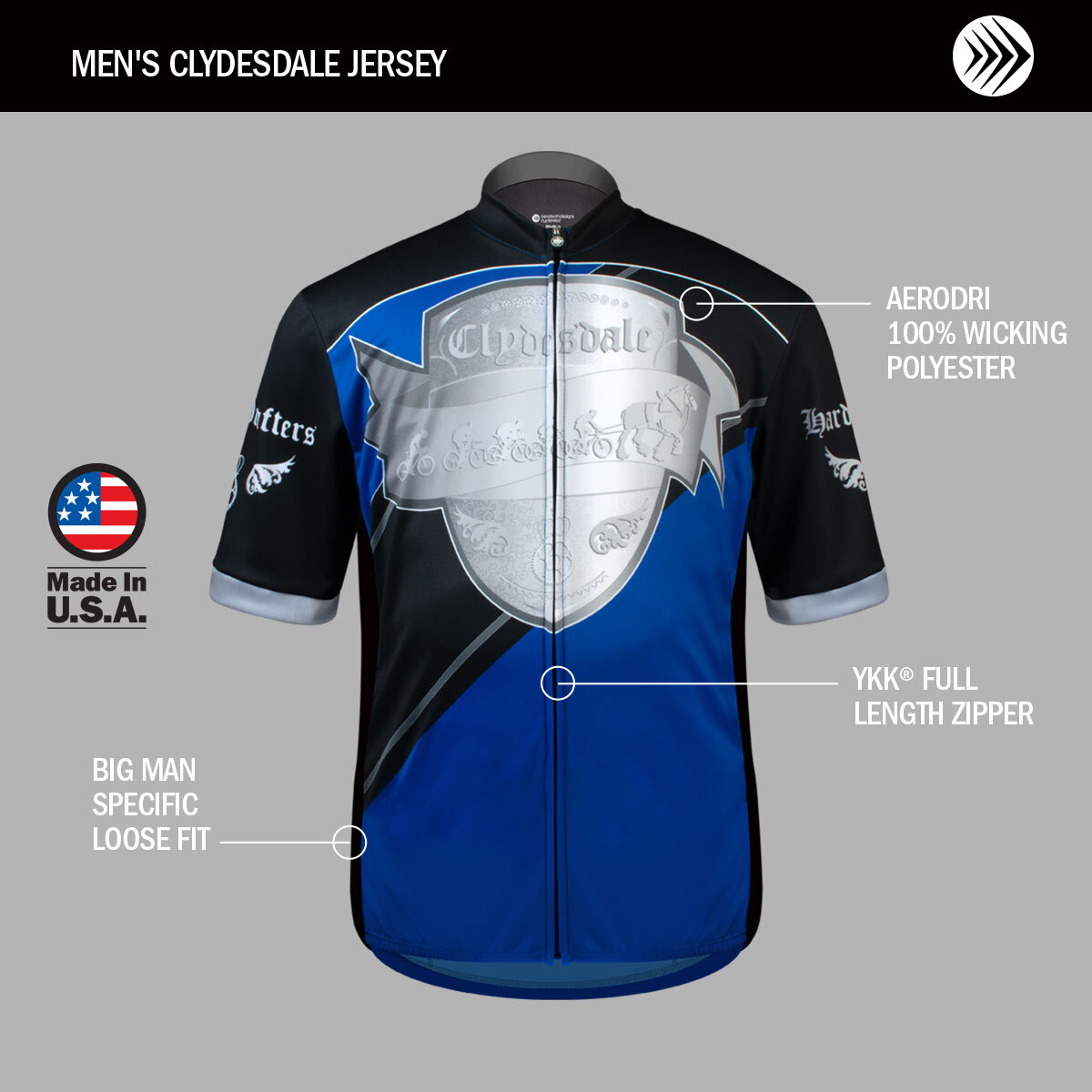 The Big Man Clydesdale Cycling Jersey is inspired by the power, endurance, and presence of the iconic Clydesdale horse. Known for its strength and stamina, the Clydesdale symbolizes the spirit of big-bodied athletes who compete with determination. Designed for maximum comfort, this jersey features a classic relaxed fit that promotes airflow, reduces chafing, and allows freedom of movement, making it ideal for long rides or casual cycling. Made in the USA with sun-protection fabric, it helps shield riders from harmful UV rays while keeping them cool and dry. Premium details such as a full-length zipper, moisture-wicking performance material, and strategically placed rear pockets provide functionality and convenience on every ride. Built for big cyclists, this jersey blends strength, style, and comfort in one durable package.