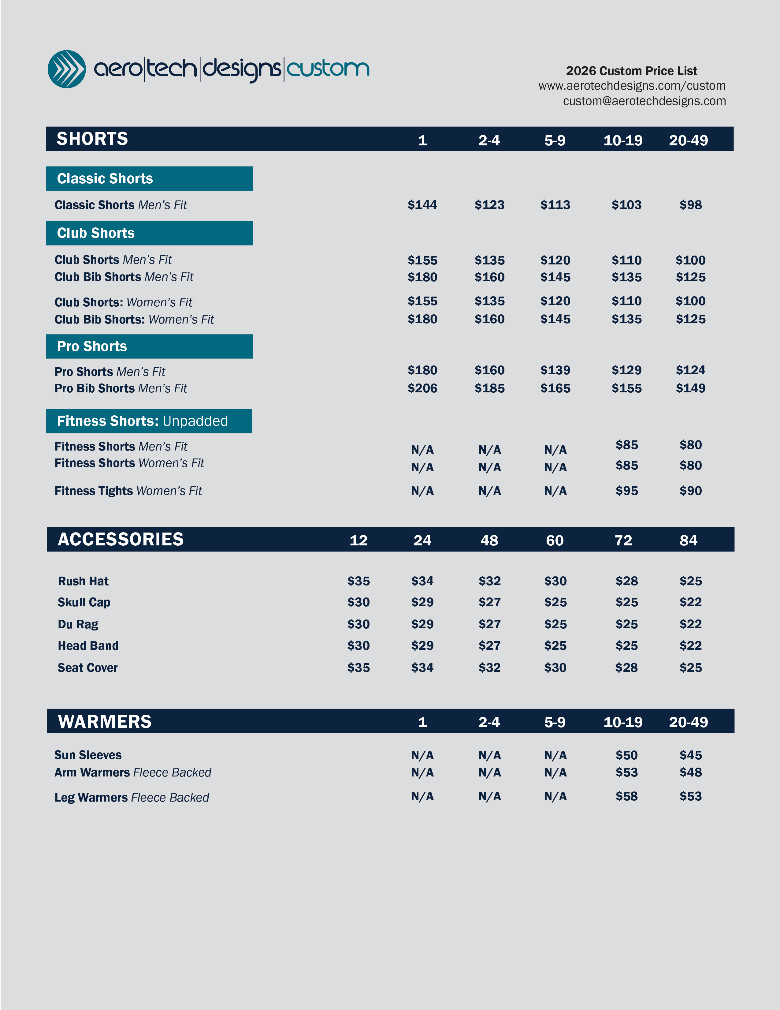W. PRO Jersey | $175 | $155 | $135 | $125 | $120 |