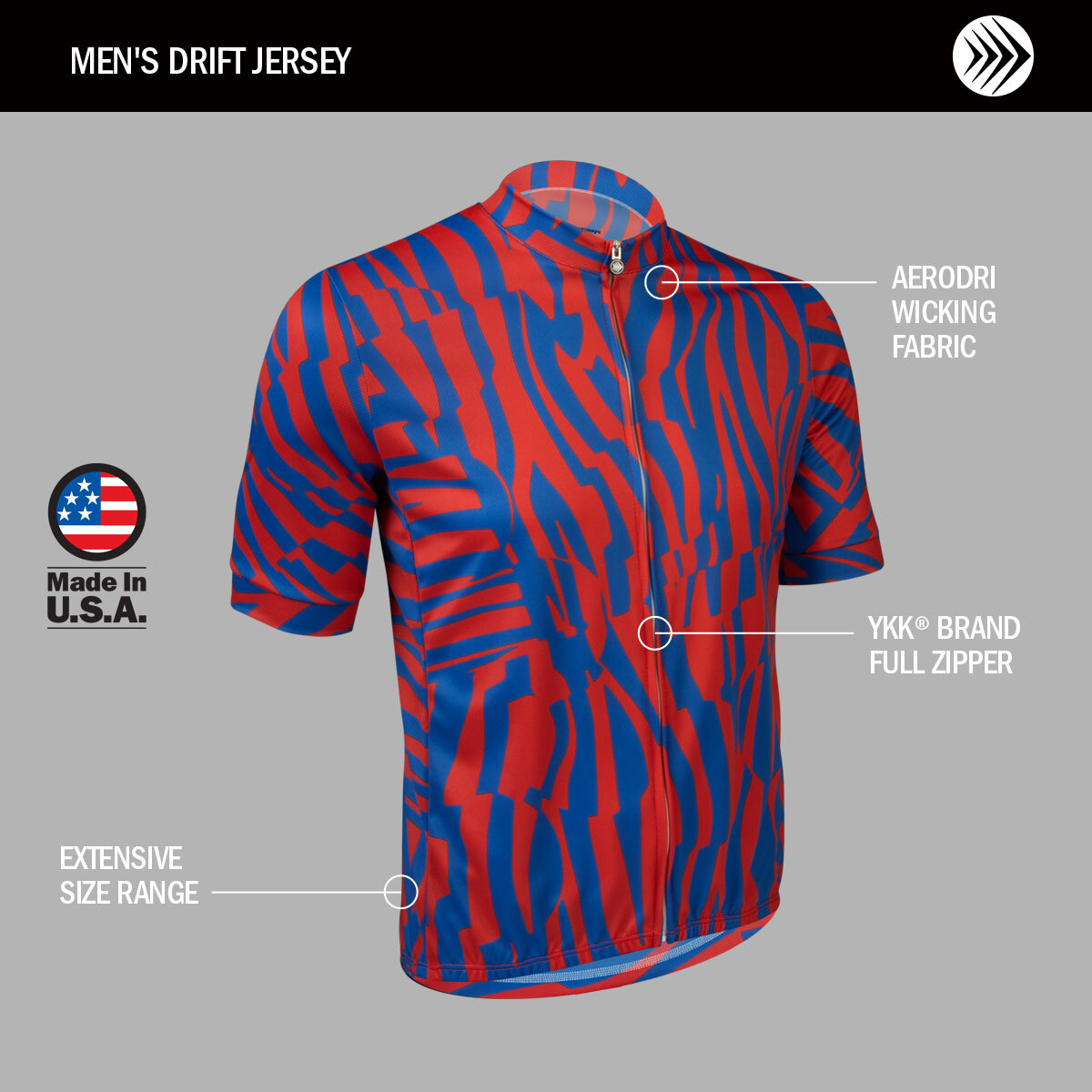 The Men’s Drift Cycling Jersey features a bold, wild print that makes a statement ride after ride. Made in the USA, it is crafted from AeroDRI fabric that delivers moisture-wicking performance and UPF 50+ sun protection to keep you comfortable and shielded from the sun on long rides. The print-ready material ensures the vibrant colors remain vivid season after season. Designed with a relaxed fit and available in sizes from X-Small to 5X-Large, plus tall options from Medium to 4X-Large, this jersey offers inclusive comfort. With premium details like a YKK zipper, a 3M reflective pocket tab, and durable stitching, the Drift Jersey blends standout style with reliable performance and lasting quality.