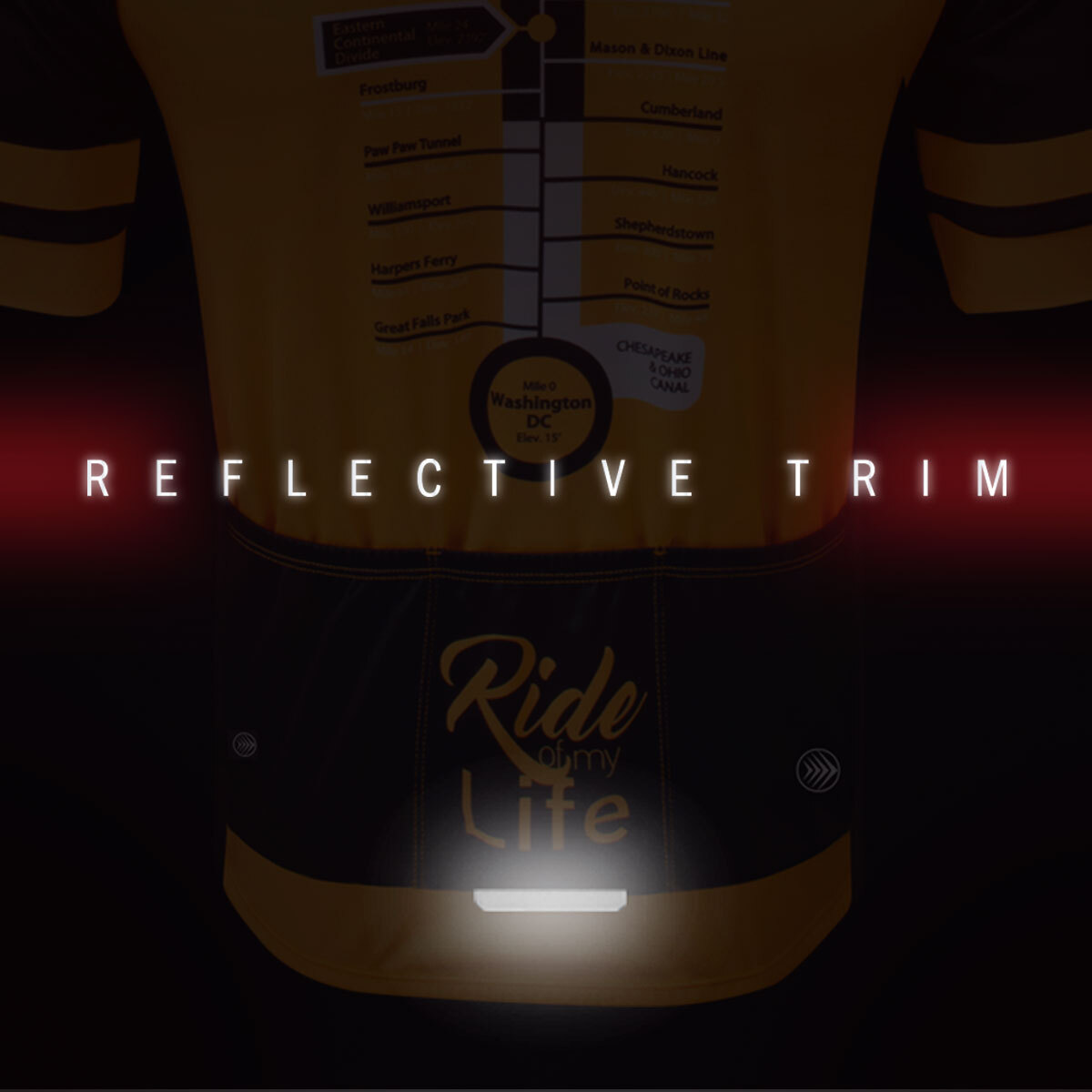 Back reflective trim increases visibility in low light by catching headlights and streetlights for safer night rides