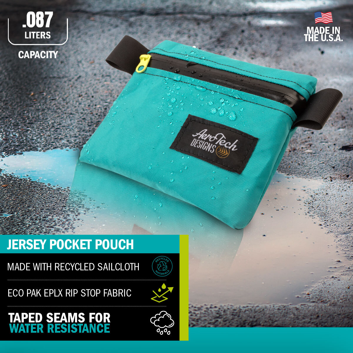 Compact .087 L recycled sailcloth pouch with taped seams keeps keys, cash, and cards dry on every ride