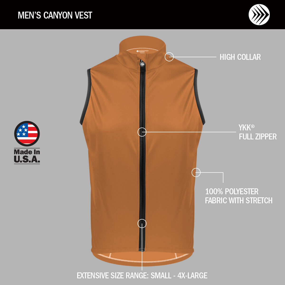 Built for unpredictable miles, the Canyon Windproof Cycling Vest is the grab-and-go layer that blocks chill without weighing you down. The smooth laminated polyester shell trims the wind and sheds light road spray, while a full separating YKK zipper lets you fine tune ventilation on the move. Low-profile reflective details add visibility at dawn and dusk, and three easy-reach rear pockets keep snacks, tools, and gloves close. When conditions improve, the vest packs down small to tuck into a jersey pocket so you can keep rolling. Designed, developed, and manufactured in the USA with an extended size range for a dialed fit.