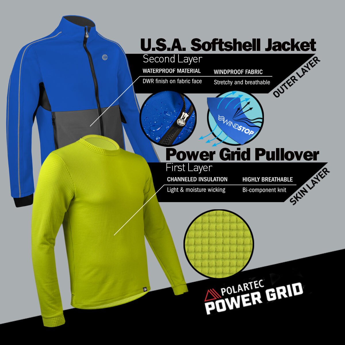 Lightweight gridded fleece that traps warmth and moves moisture away from the skin. Open channels increase breathability and reduce bulk for easy layering