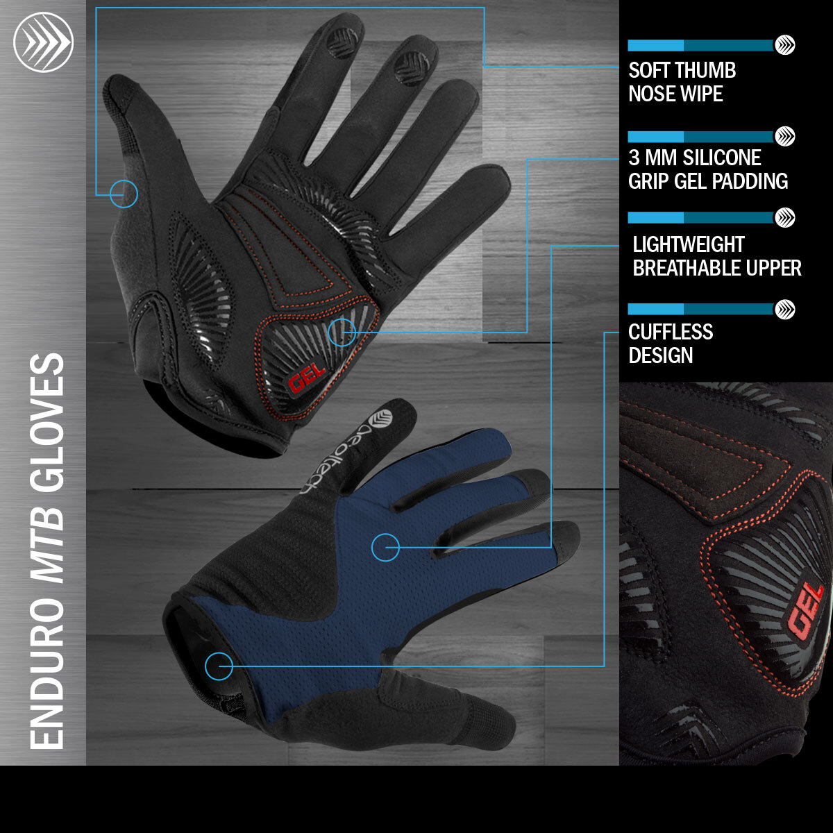 The Enduro MTB Gloves deliver comfort, control, and safety for every ride. Built with 3mm palm padding and silicone grippers on the palms and fingertips, they provide a secure, slip-free hold on the handlebars. A high-visibility mesh top with a reflective logo enhances rider safety in low-light conditions, while the cuffless, stretch construction ensures a flexible, comfortable fit. Finished with a soft thumb panel for wiping sweat, these gloves combine durability and performance for mountain biking and beyond. Available in sizes Small to 3X-Large.