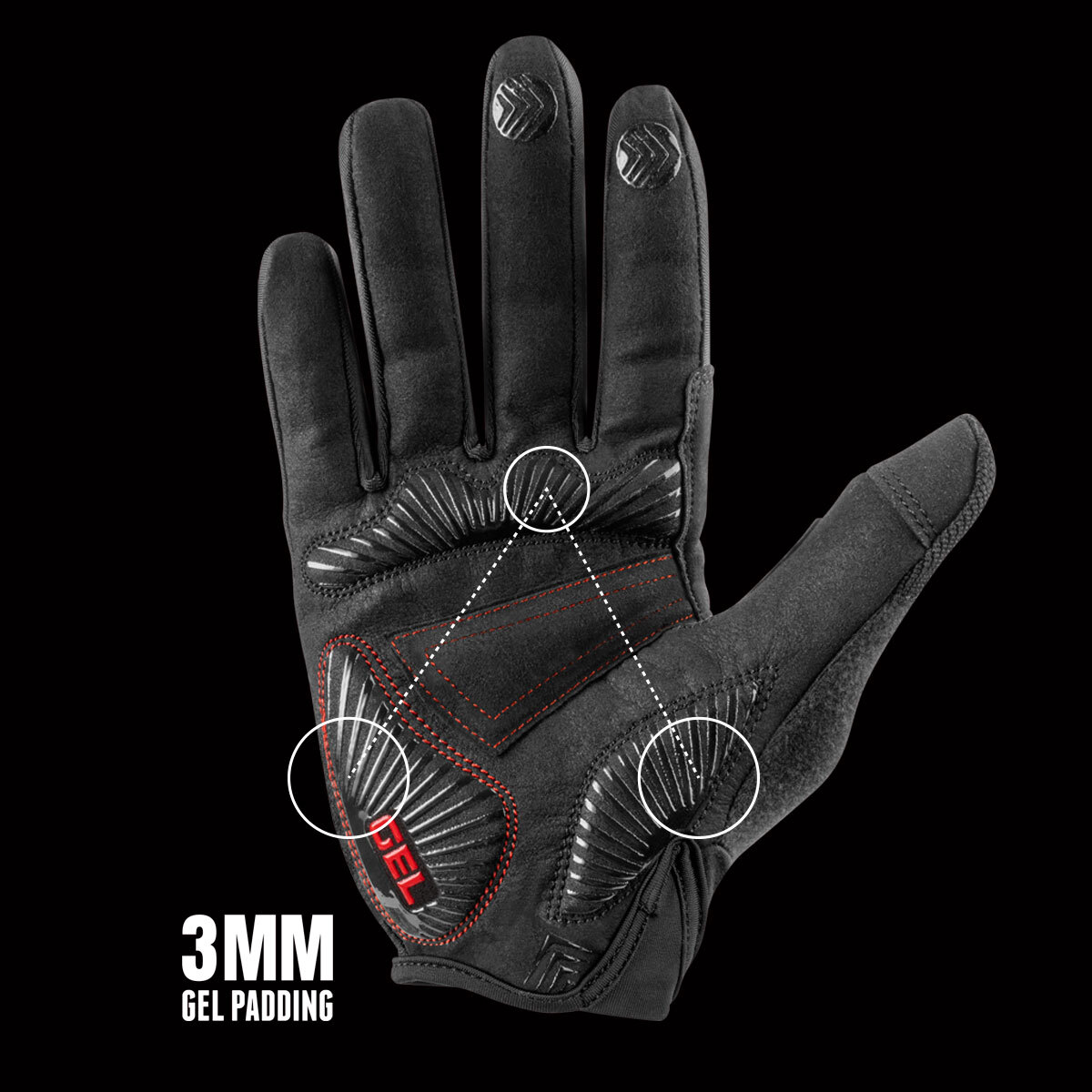 Strategic gel zones cushion high-pressure areas of the palm. They absorb road vibration and reduce hand fatigue on long rides