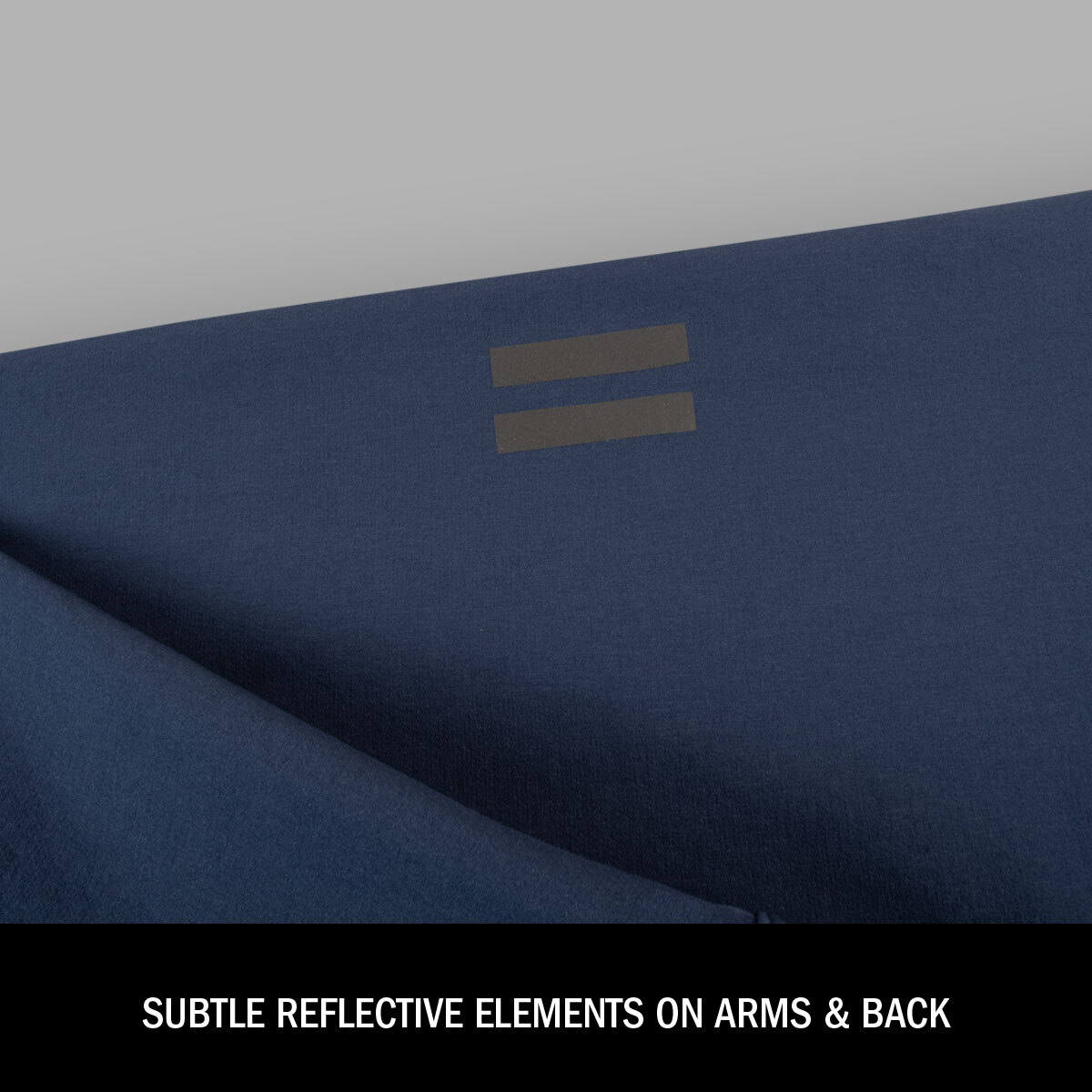 Integrated low-profile reflective accents on the arms and back enhance visibility in low-light conditions