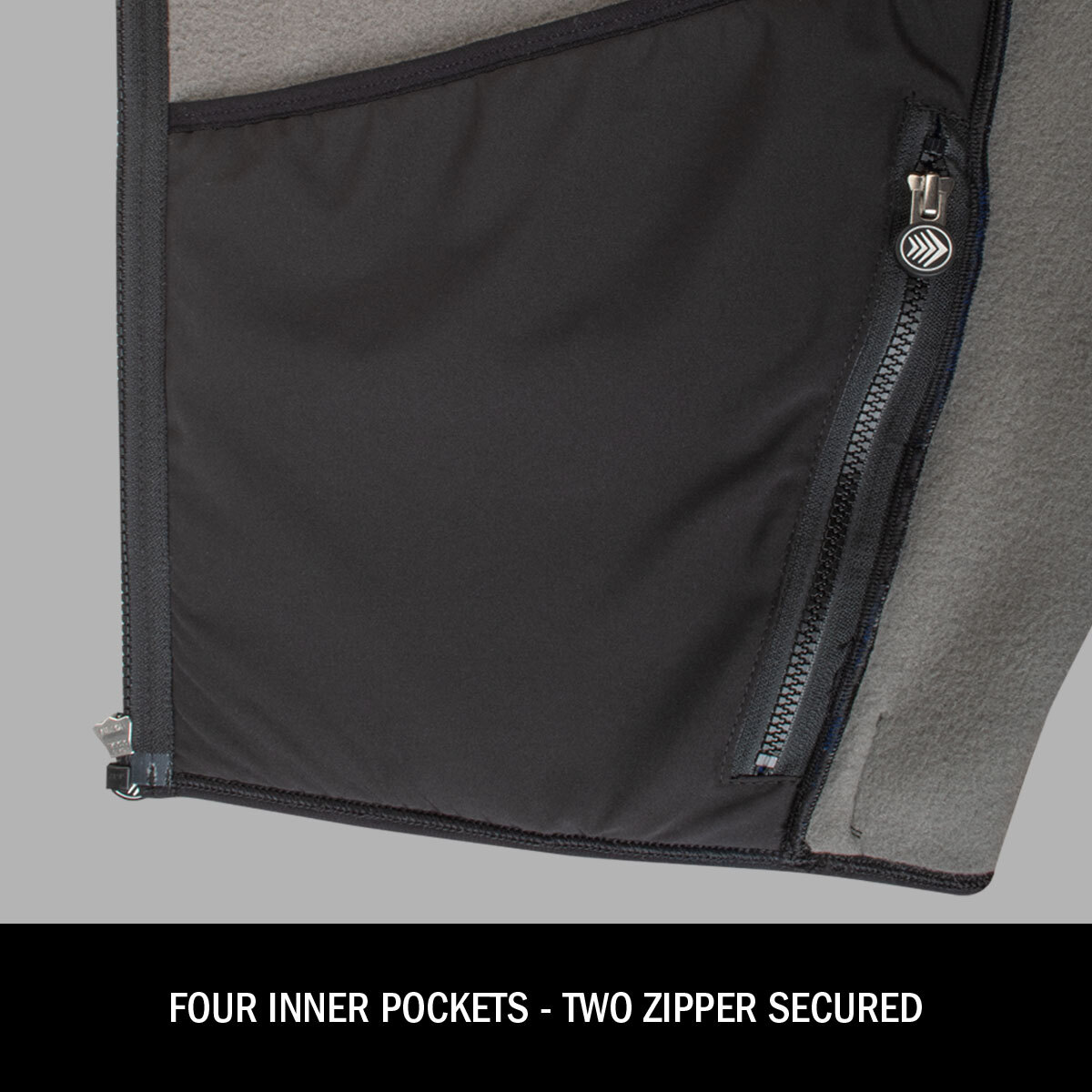 - Six Storage Pockets — Two Open Outer Hand Pockets | Two Open and Two Zippering Internal Pockets