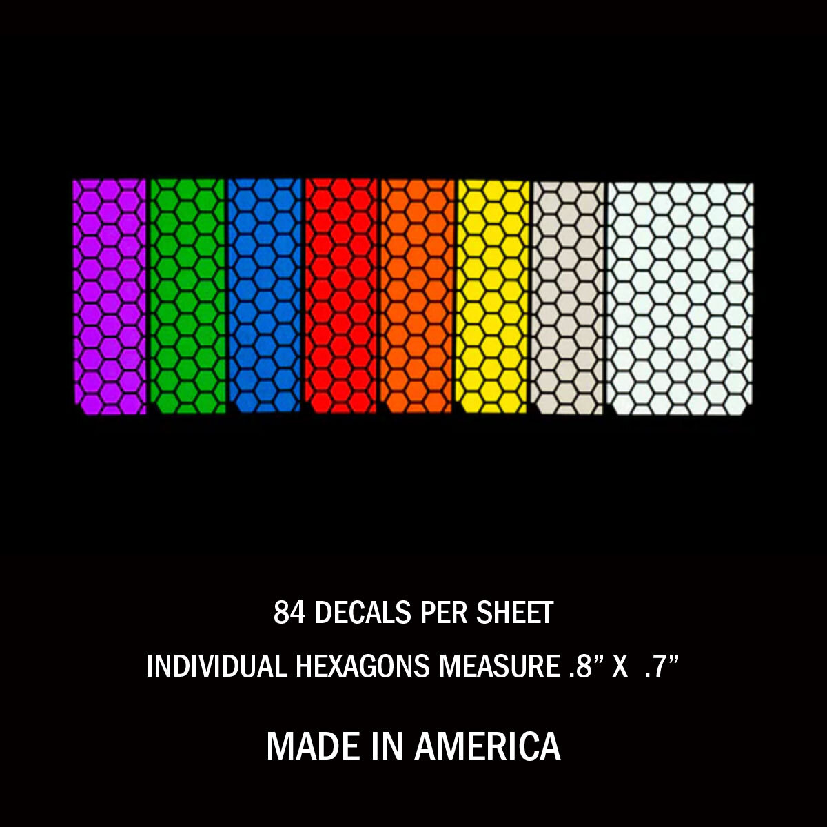 A versatile 84-piece kit of .8" x .7" hexagons is precision-cut from American-made, engineering-grade film for a fully customizable safety layout on your frame, helmet, or rims
