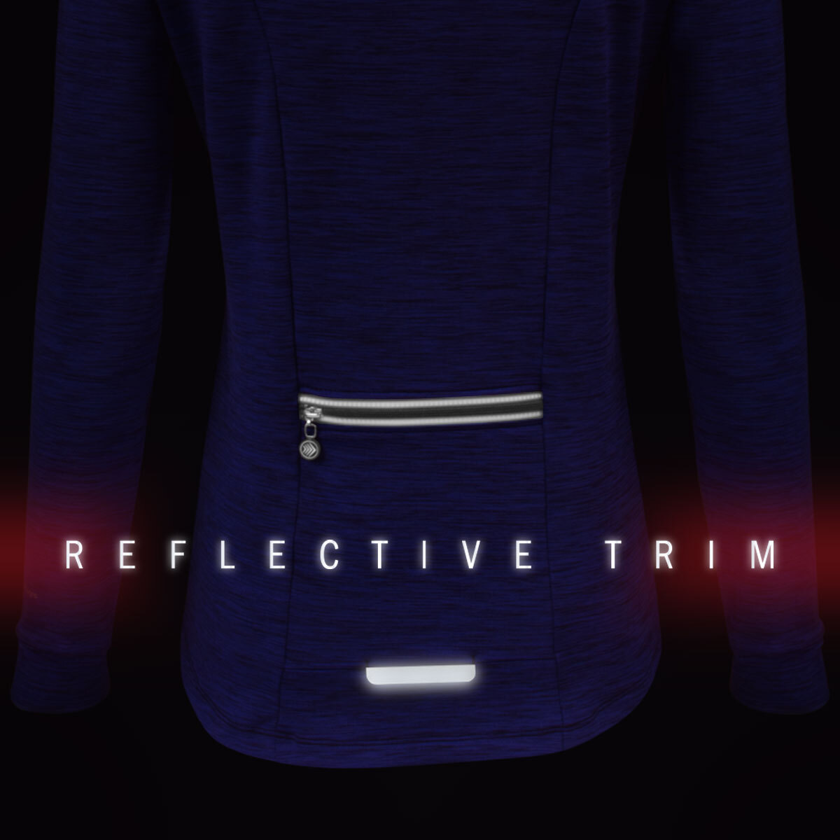 Secure rear zip pocket keeps phone, keys, or gels in place. Low profile reflective tab adds visibility in low light