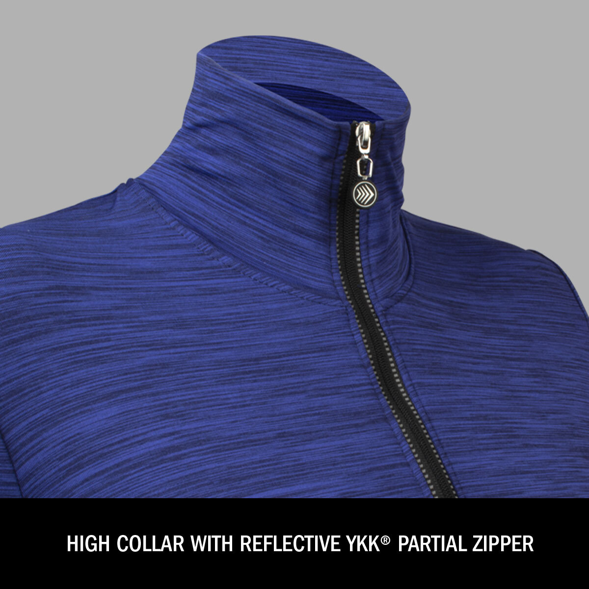 Raised collar adds coverage from sun and wind. Reflective zipper pull allows quick venting and is easy to use with gloves