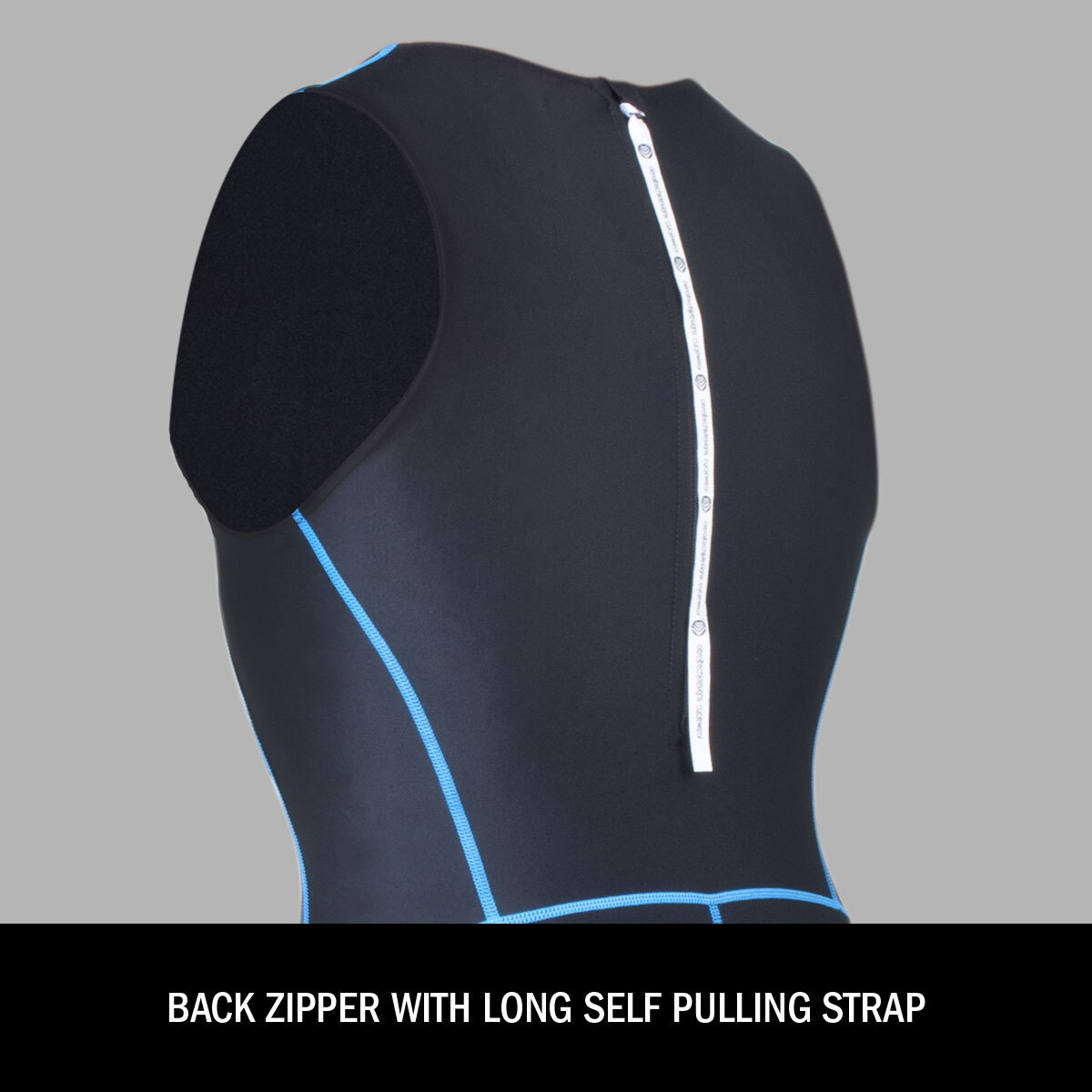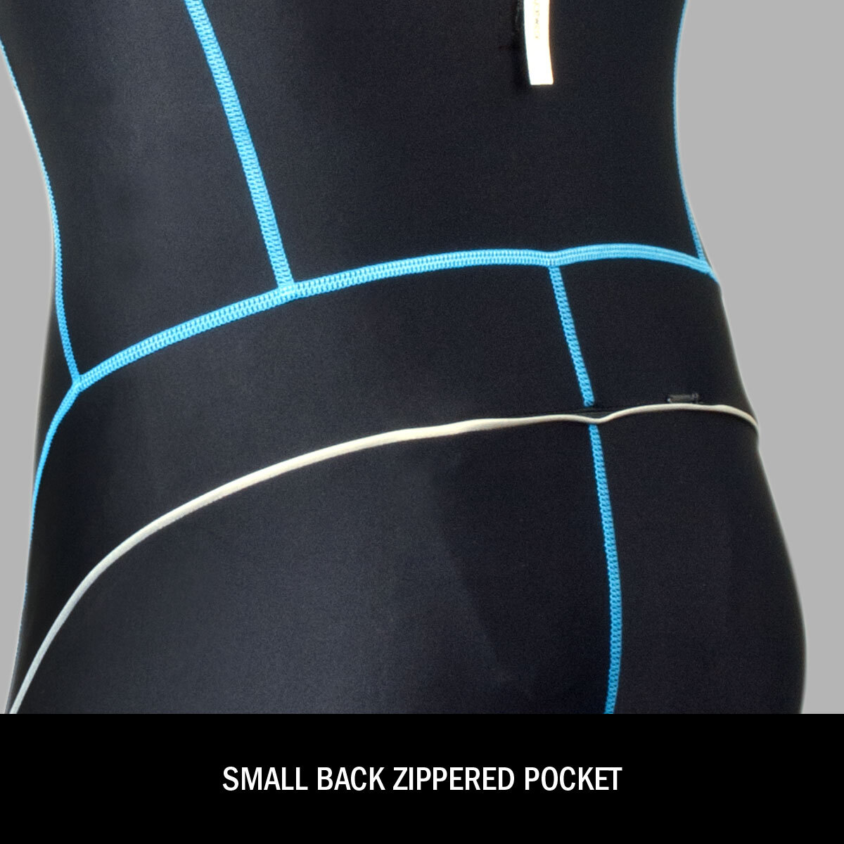 - Aerodynamic one piece triathlon suit is ideal for swim, bike, run events