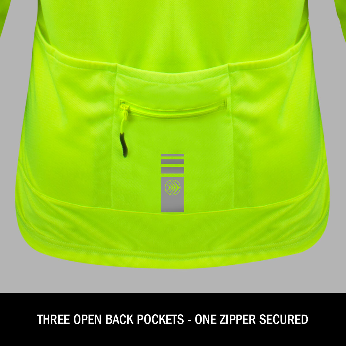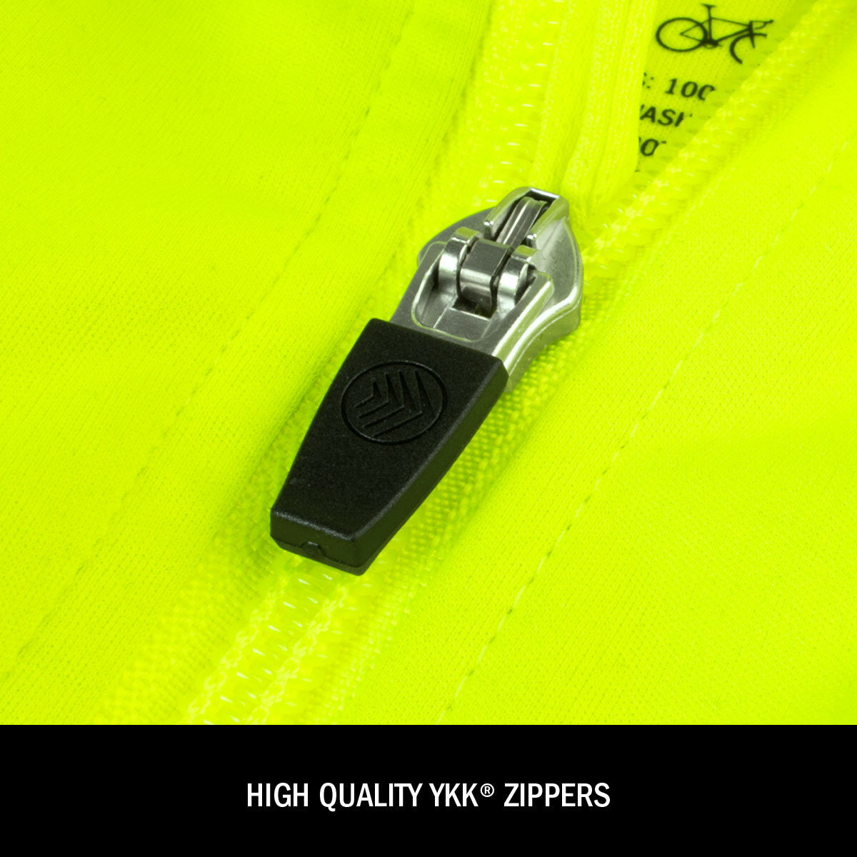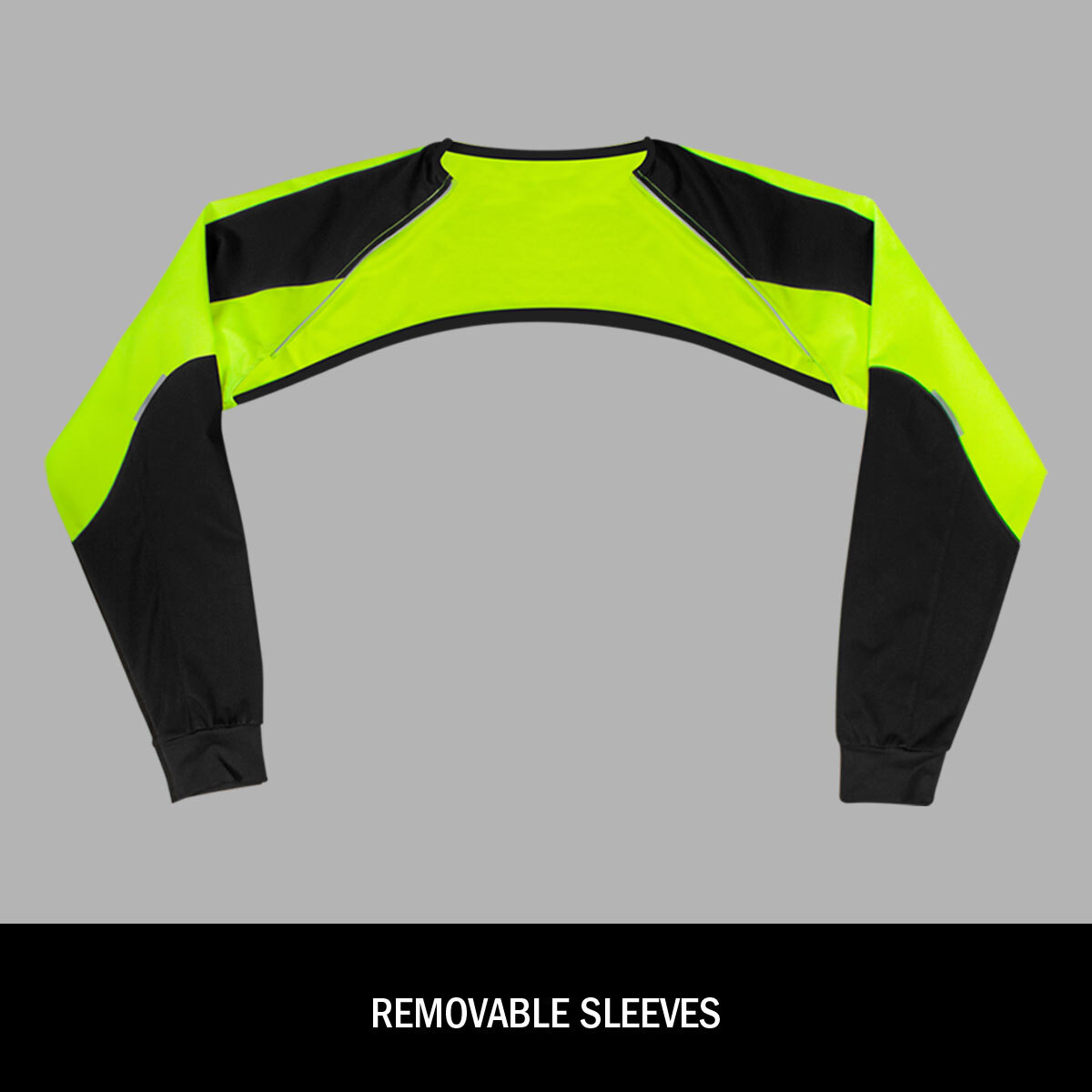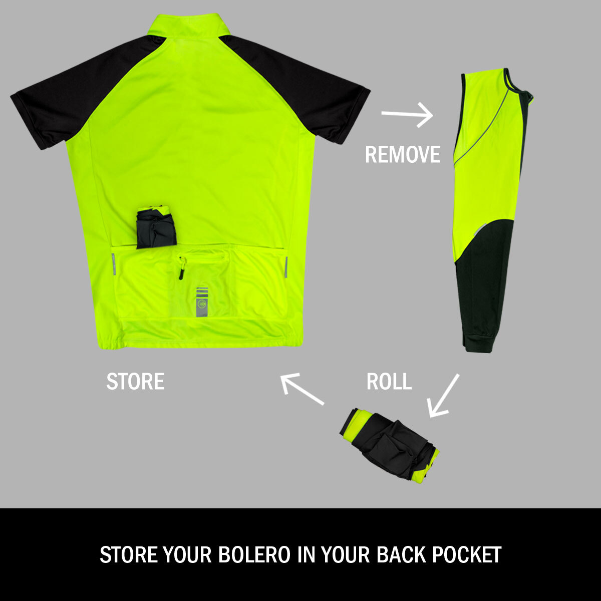 The Maya Bolero is a high-visibility safety yellow jacket with zip-off sleeves that converts to a windproof jersey. Reflective accents boost visibility in low light, and all zippers, including the removable sleeve zips, are premium YKK with easy-grip rubber tabs. Storage is dialed with three reach-in rear pockets plus a secure zippered back pocket for gear or fuel on long rides.