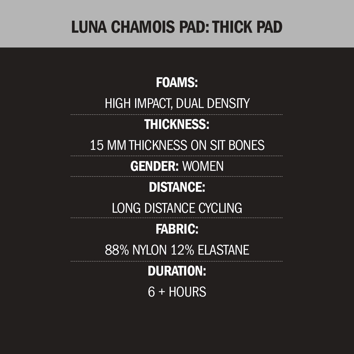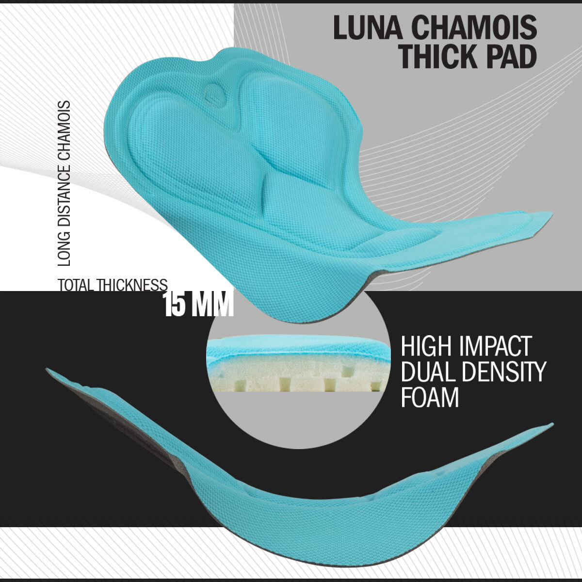 - 15mm thick Luna Chamois with multi-density foam for long-distance support