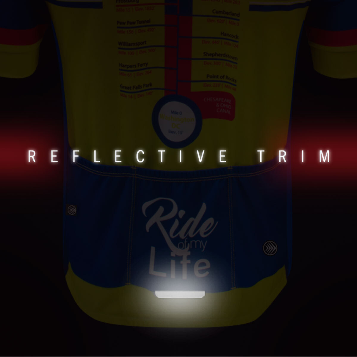 Back reflective trim increases visibility in low light by catching headlights and streetlights for safer night rides