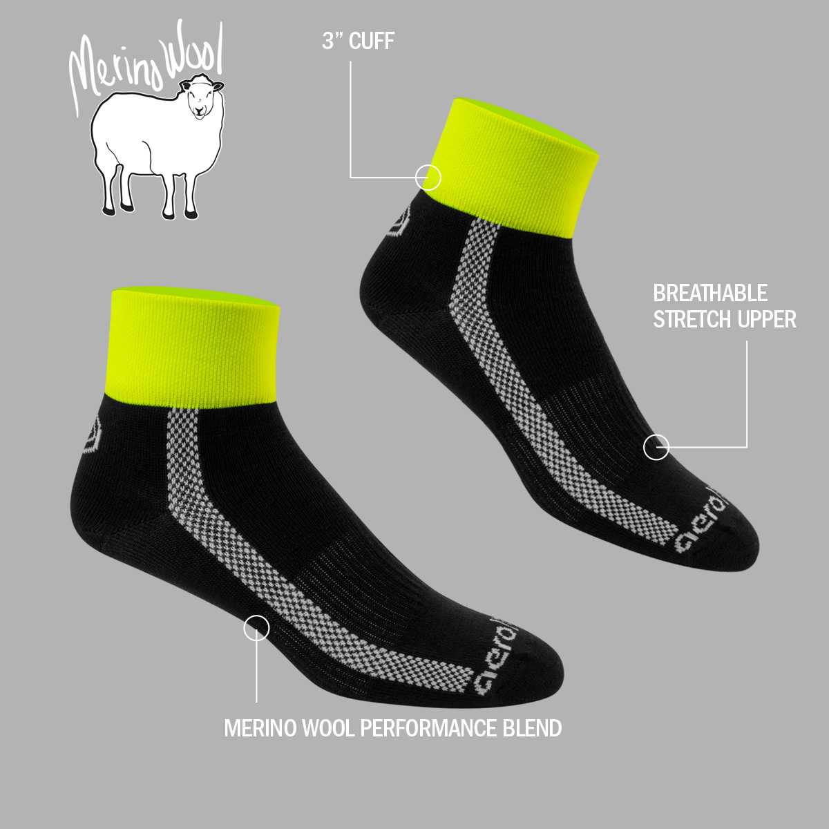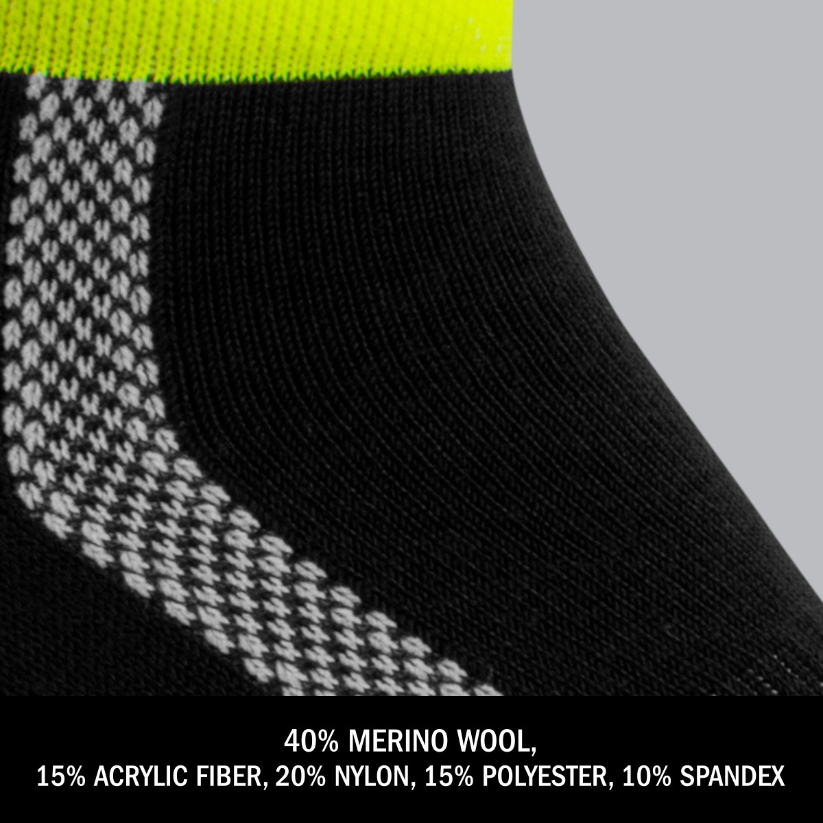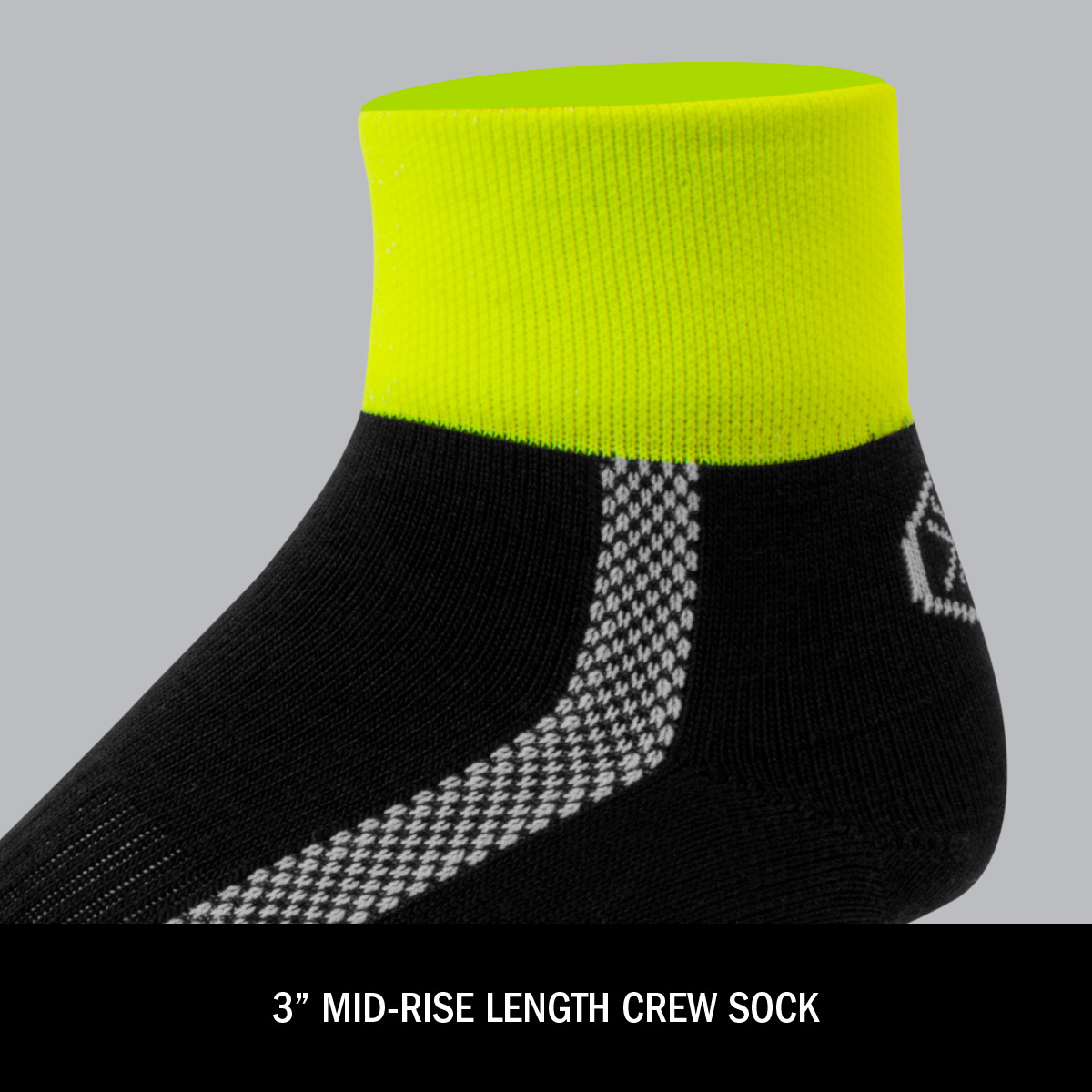 Merino wool naturally wicks sweat and dries fast, keeping feet comfortable during rides, runs, and everyday wear. These short ankle socks use a performance Merino blend with nylon and spandex for durable stretch, shape retention, and built-in odor control. A breathable knit and lightly cushioned sole add comfort without bulk, while the 3" high-visibility safety-yellow crew cuff and quality construction ensure long-lasting performance.