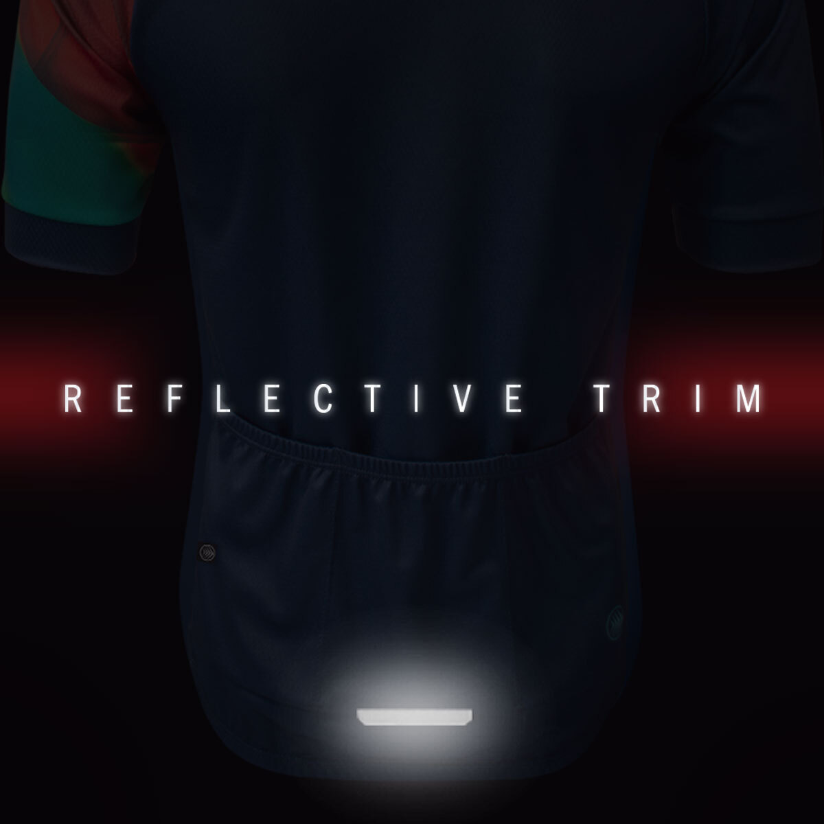 Back reflective trim increases visibility in low light by catching headlights and streetlights for safer night rides