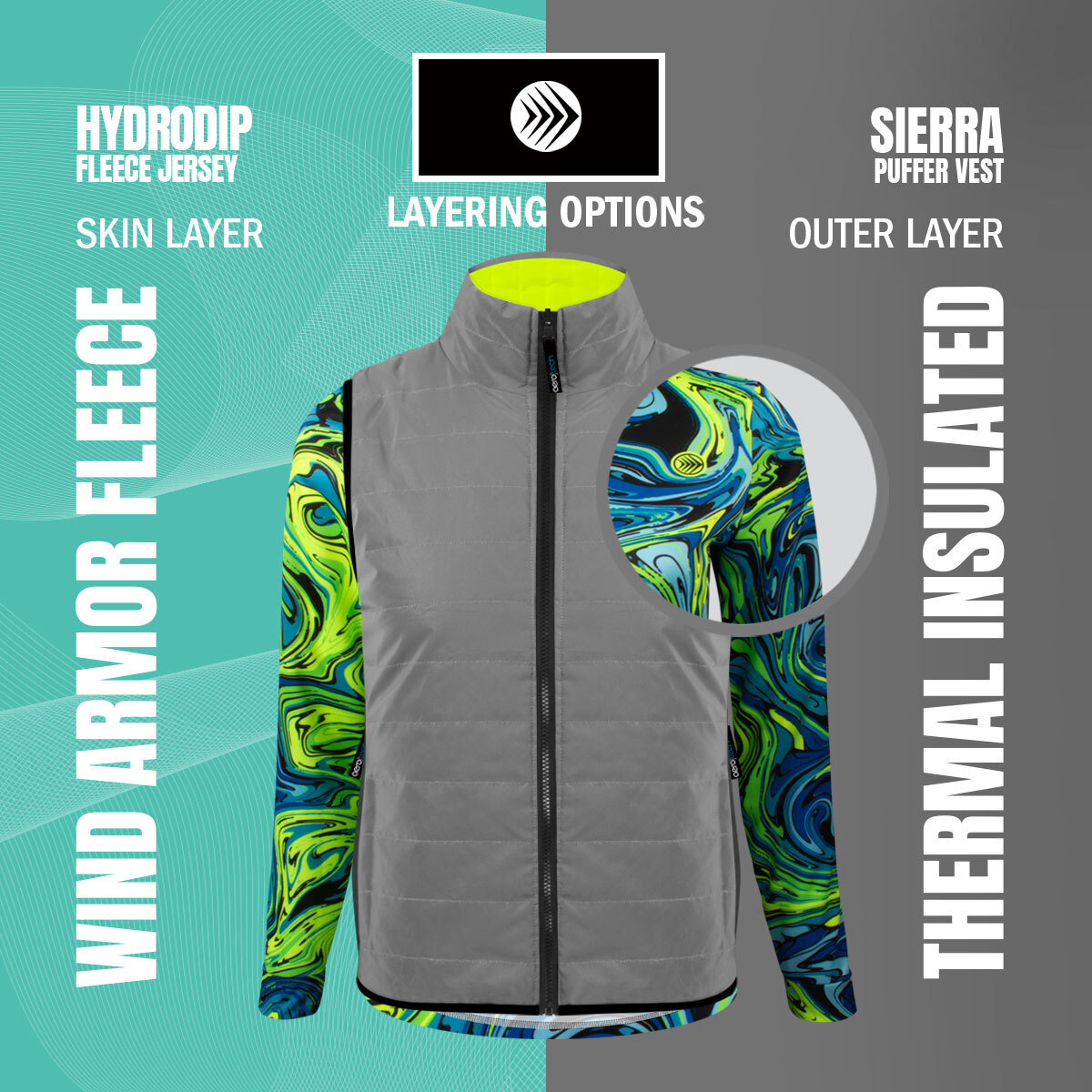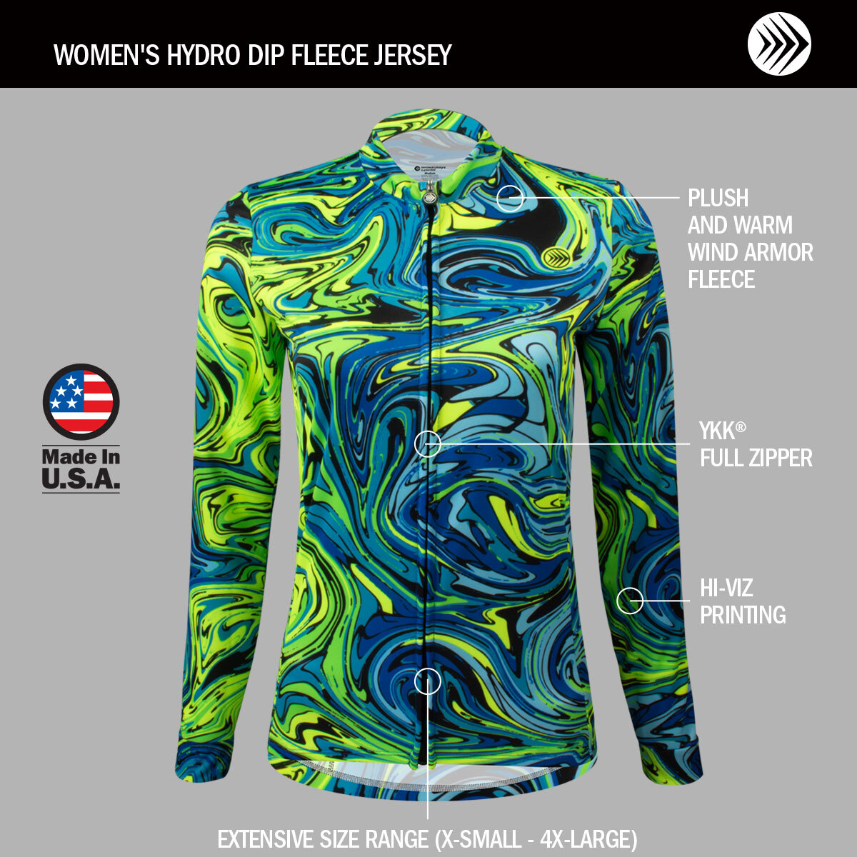 Bring bold color and cold weather comfort to your rides with the Women's Hydro Dip Empress Long Sleeve Cycling Jersey. Built with warm, breathable fleece performance fabric, it balances insulation and moisture management so you stay comfortable on cool days. The women's tailored fit flatters without restricting movement, and ride-ready details include a high quality YKK front zipper, three easy-reach rear storage pockets, and reflective accents on the zipper and back pocket tab for visibility. Prepared-for-print fabric keeps the Hydro Dip graphic vivid, and the extended size range ensures a great fit. Proudly made in the USA.